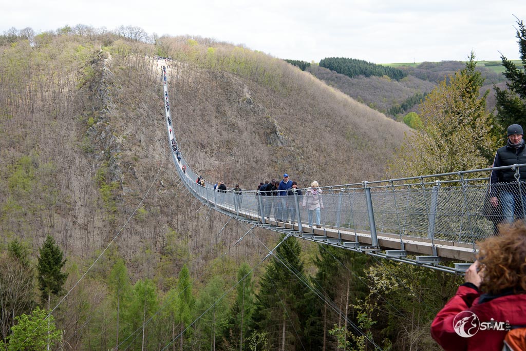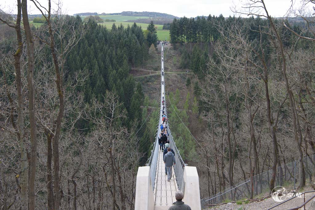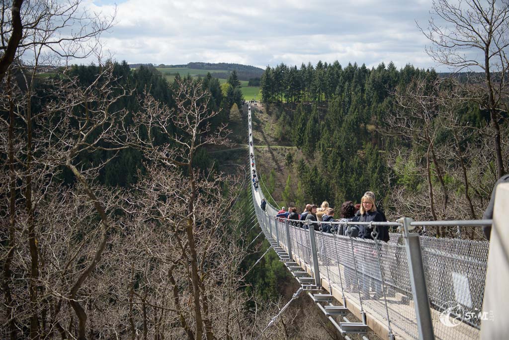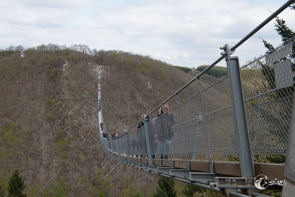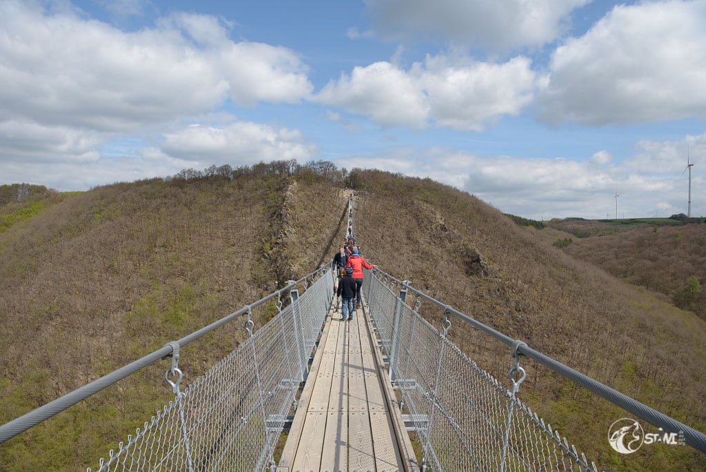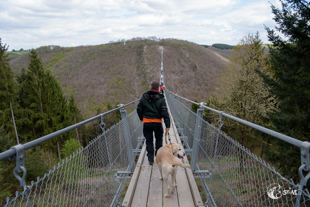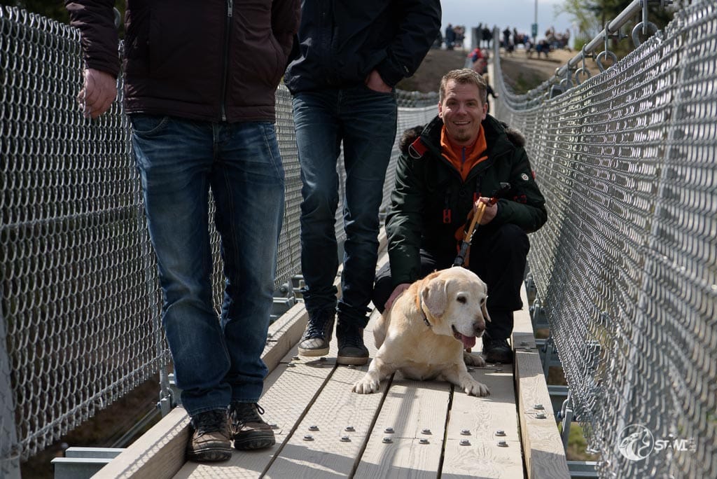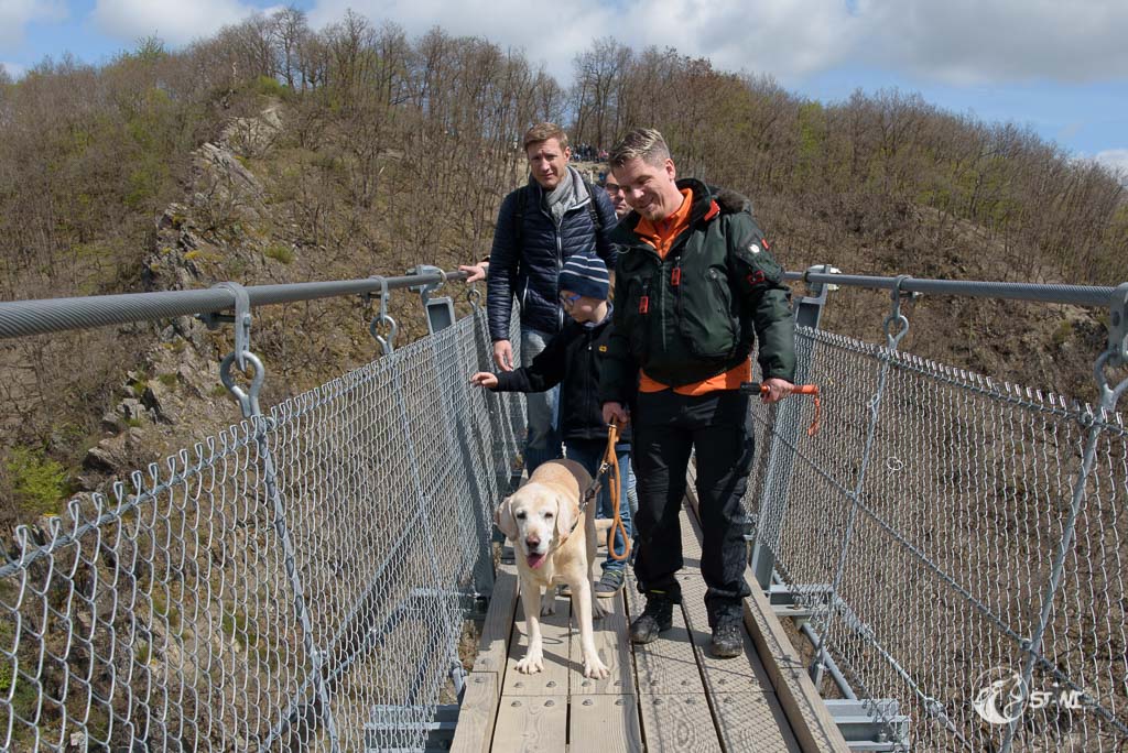 Dann kamen wir an der Geierlay an. Hier knubbelten sich etwas die Menschen. Doch es war alles noch überschaubar. Schnitzel war am Anfang bisschen unsicher, wie die meisten Menschen auch. Bei Schnitzel lag es wohl an der Tatsache des Dielenbodens und das leichte Schwanken. Das machte teilweise auch gestandene Männer etwas nervös.